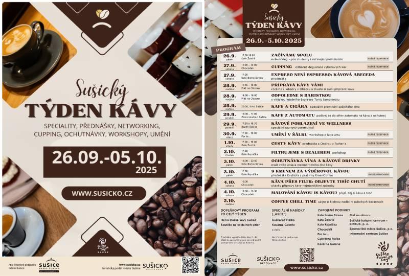 Káva a relax – to je spojení, na které v pozdním létě sází Sušice. Dvanáct místních podniků připravilo program plný chutí, vůní a zážitků. Návštěvníci si vyzkouší cupping, latte art i nejrůznější techniky filtrování kávy. Připraveny jsou také přednášky na různá témata, malování kávou, speciální saunové ceremoniály v sušickém bazénu i tematické promítání v kině. Na své si přijdou milovníci výběrových káv, italského espressa i ti, kdo nedají dopustit na kávu z automatu. Kompletní program je k dispozici na webu www.susicko.cz. Díky podpoře města Sušice je navíc většina akcí zdarma.